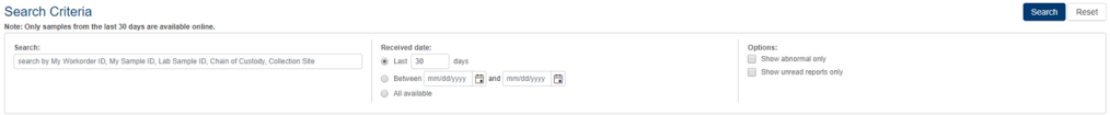 see results for workorders, a patient name, custom sample ID, or MRN.