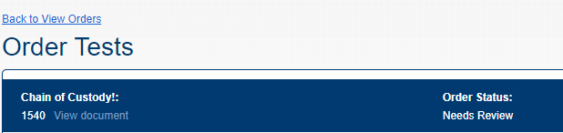 The order opens with the chain-of-custody number and status displayed at the top of the page. You can click Back to View Orders to return to the Orders page. For some orders, you can click the View document link to view the chain of custody or requisition form associated with the order.